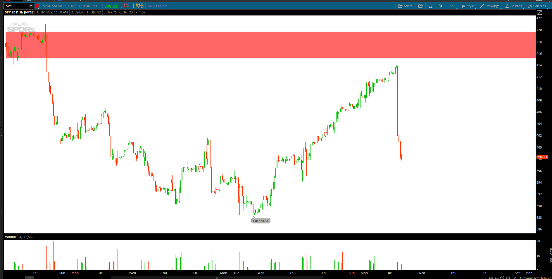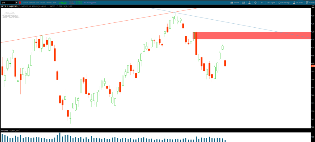 “Spy bears may allow price to climb right into the supply zone before they take over. If bears overpower bulls in the 415.50-417 area, then bears could retest back into the 390’s to retest the trendline support. Demand zone in the 3XX area.“